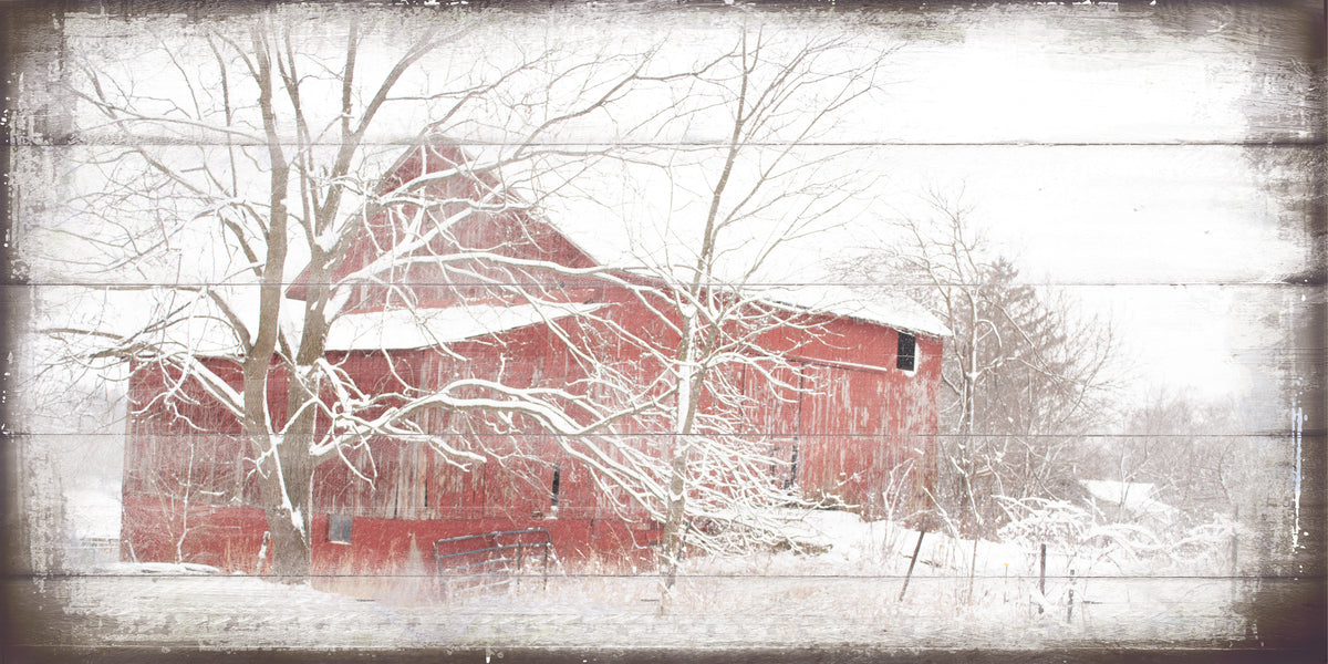 The weathered red barn takes center stage, its faux aged wood exuding character and history. The striking crimson hue contrasts beautifully with the pure, untouched snow, creating a stunning focal point.