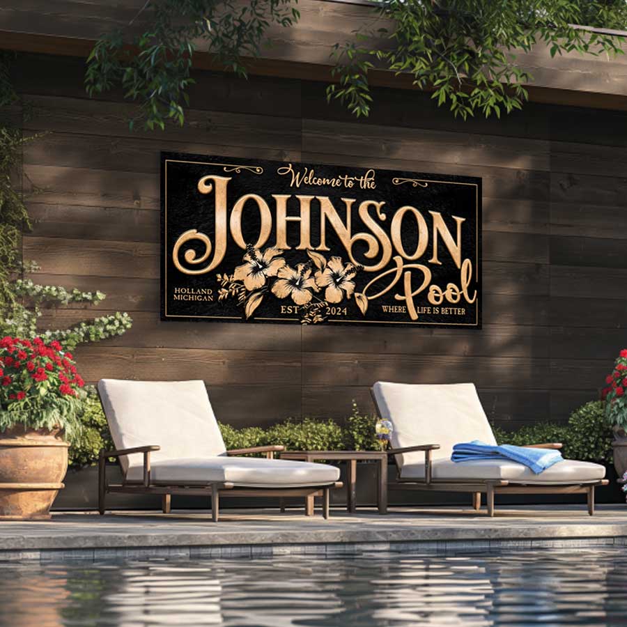 Elevate your outdoor oasis with our Personalized Pool Signs, Custom pool signs: Introducing our Metal Personalized Pool Sign, a stunning addition that will take your pool decor to the next level. Crafted from top-quality metal, this sign is built to endure even the sunniest of environments, ensuring its longevity and durability.