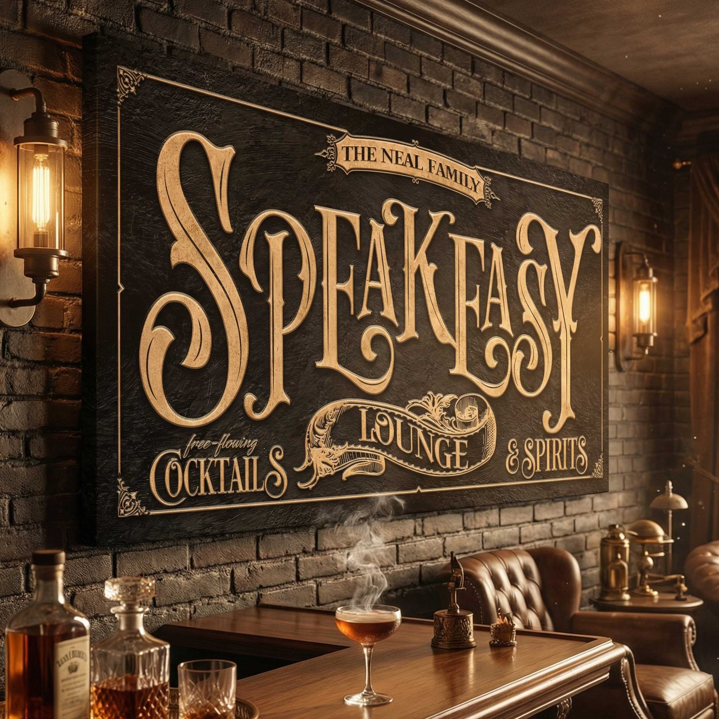 Looking to transform your bar space into a sophisticated speakeasy Bar? Look no further than our stunning speakeasy sign! Crafted with the finest materials, our sign is the perfect addition to any bar seeking to capture the essence of the prohibition era. Tailor Made Room's personalized Speakeasy Lounge Sign are made of both canvas, acrylic & metal. Perfect for any home basement, or billiard room.