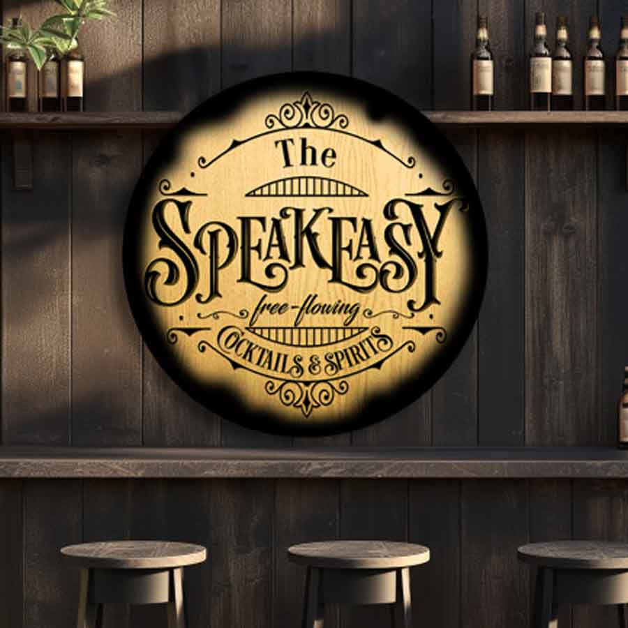 The Tailor Made Room's personalized Bourbon Speakeasy Sign is skillfully cut into a circle, made to appear as a old bourbon barrel lid, adding a unique touch to your space. Whether in a home basement or billiard room, this metal sign is the perfect accent.