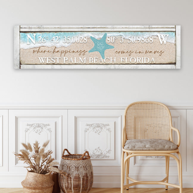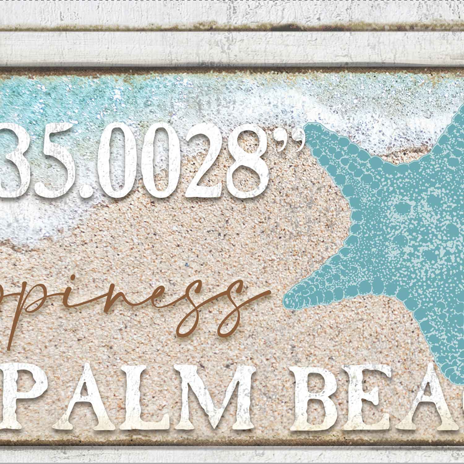 Imagine a coastal wall decor sign that captures the essence of wanderlust and adventure. Crafted with meticulous attention to detail, this art piece features your homes latitude and longitude coordinates placed elegantly onto a weathered "faux" weathered wooden plank. The backdrop is a beachscape, where golden sands meet the gentle caress of the crystal-clear ocean waters.