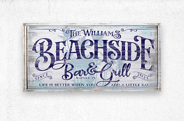 Crafted with care and love, this sign captures the essence of seaside life. Its elegant lettering, carefully hand-painted in a weathered navy blue, spells out "Beachside Bar & Grill." Behind these words, delicate palm trees add a touch of coastal whimsy.