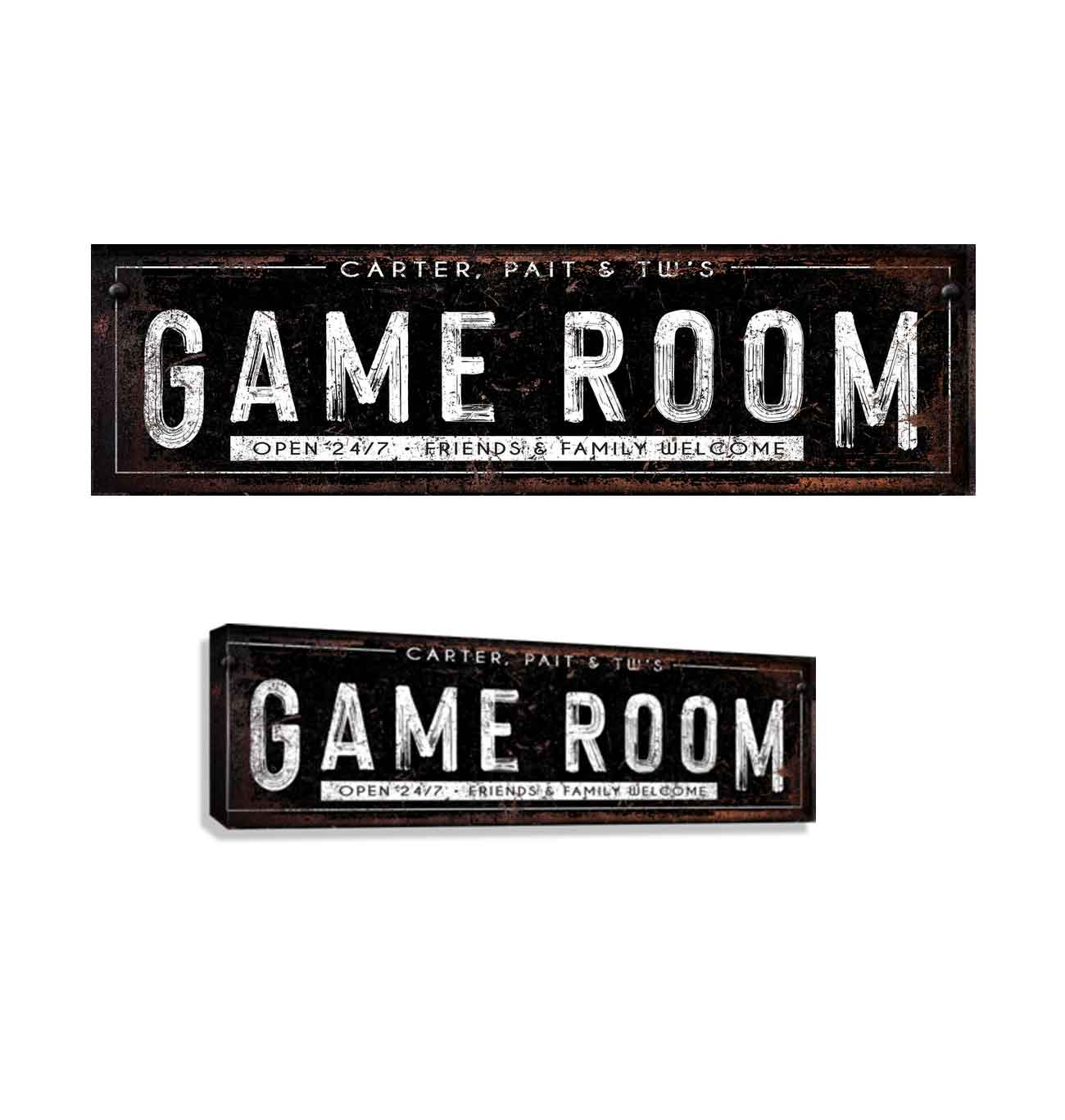 Gaming Room Decor of a big black sign that says: Game Room, open 24/7, Friends and family welcome, Personalized with family names.