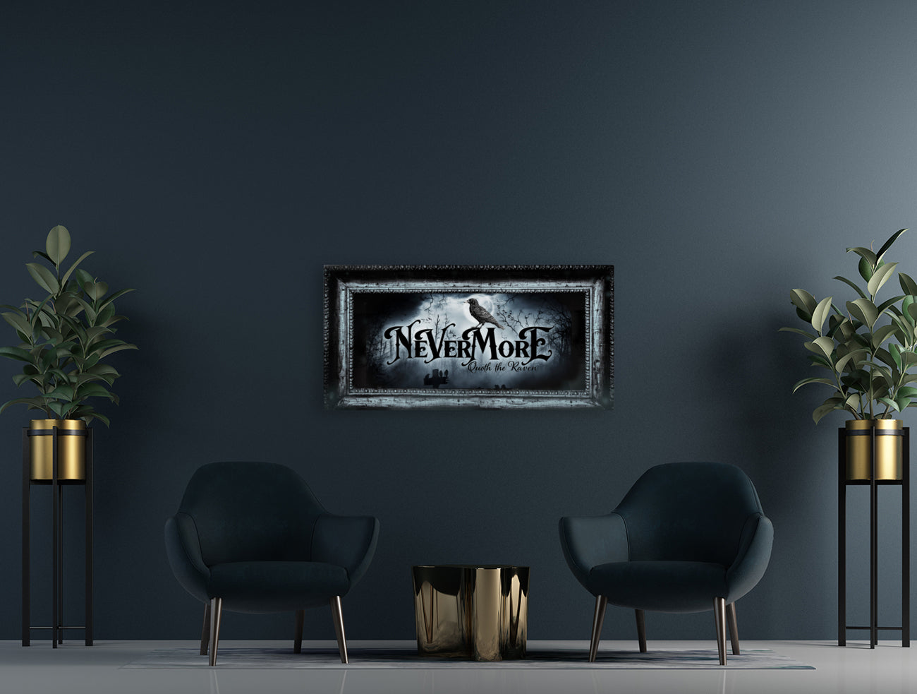 Halloween Wall Decor Nevermore Raven on black Gothic faux frame and the words Nevermore Quoth the Raven.