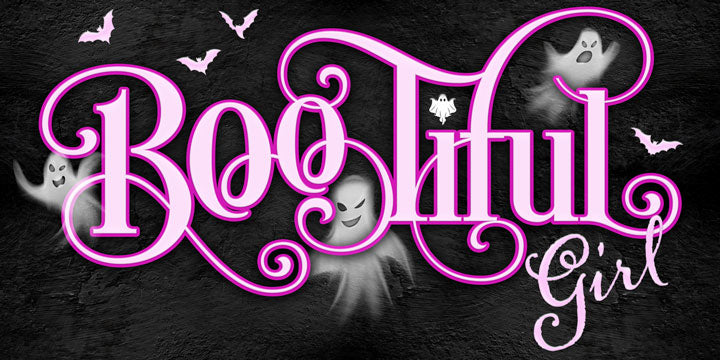 Pink Halloween Wall Decor Sign that says Bootiful Girl on black stone background and with ghost peaking around the pink letters.