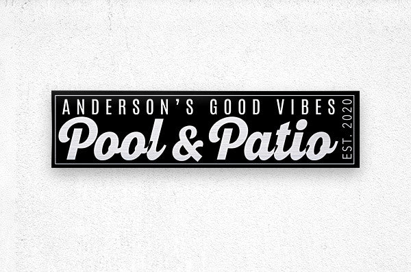 Emblazoned in crisp, eye-catching white lettering, the sign proudly displays your personalized name alongside the inviting phrase "Good Vibes Pool and Patio." It's not just a sign; it's a statement – a declaration of your commitment to creating a space filled with positivity and relaxation.