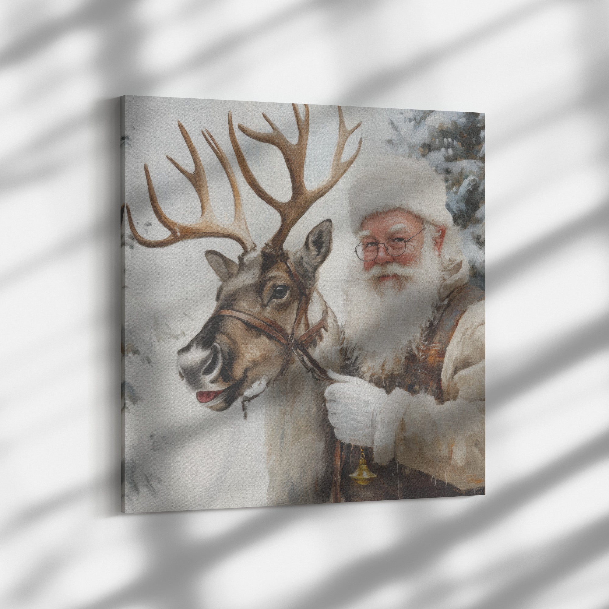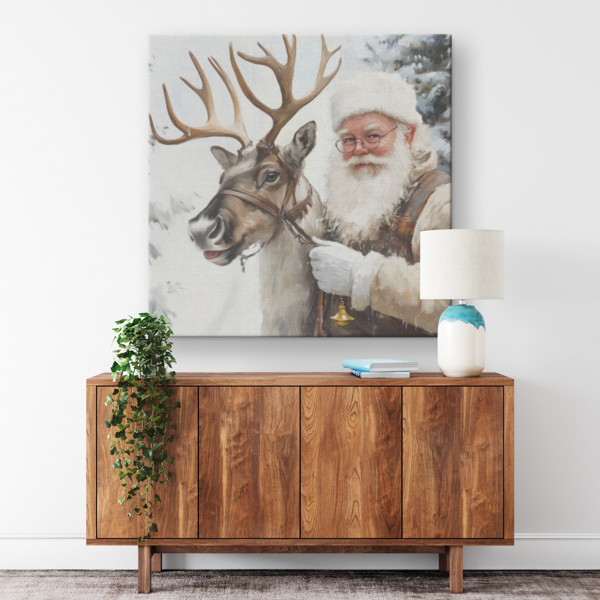 Printed on premium, fade-resistant paper, this vintage Santa art is perfect for those who love traditional holiday decor with a touch of elegance. Ideal for mantle displays, entryways, or as a thoughtful gift, this artwork radiates the classic spirit of Christmas, adding a cozy, timeless feel to any room. Bring home the magic of an old-fashioned holiday with Santa and his reindeer by your side.
